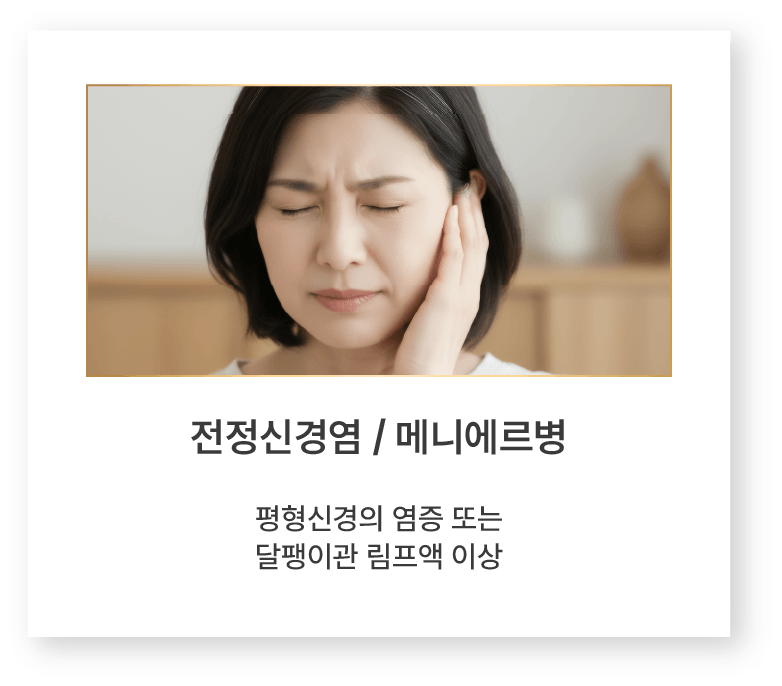 내이 기능 이상으로 발생 어지럼증 + 청력 저하 + 귀울림이 반복적으로 나타남